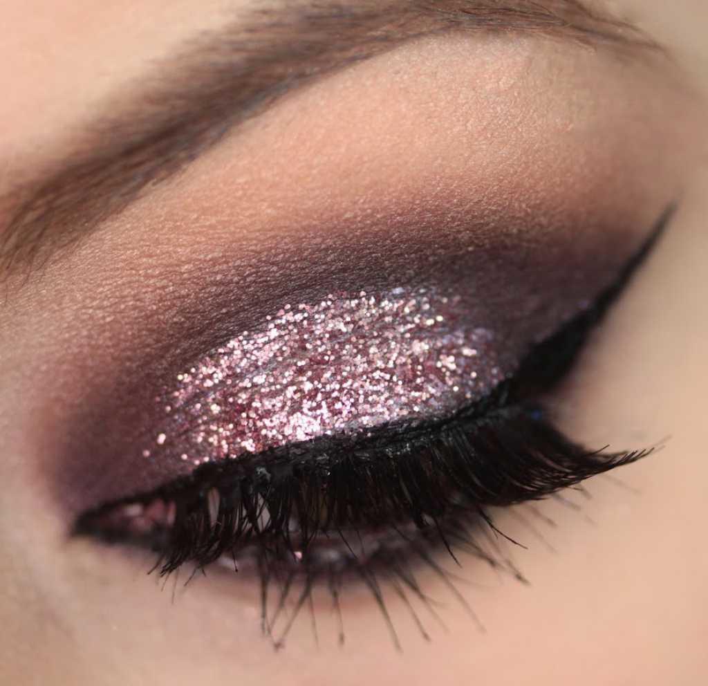 Макияж с глиттером может состоять из нескольких этапов. Сначала наносится светлый тон теней на все подвижное веко, затем темнее в складку века. Все линии тщательно растушевываются. Затем в центр верхнего века можно добавить сияющий акцент блестками, который украсит мейкап, сделает его особенным. В этом случае идеальный вариант – использовать кремовую текстуру. Рассыпчатые блестки тоже можно зафиксировать, предварительно смешав их с дюралайном.
