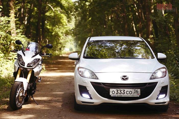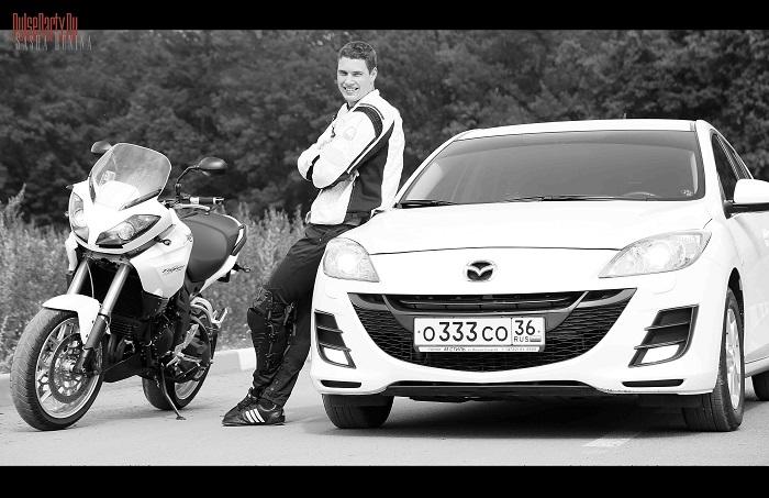 АУ: На данный момент у меня 2 средства передвижения. Это машина MAZDA 3 и байк TRIUMF Tiger 1050. Оба белого цвета, потому что мне нравится этот цвет, да и сейчас он в моде.