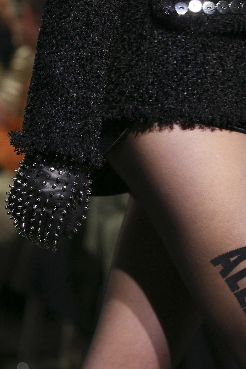 В этом году перчатки — важный элемент наряда. Они могут быть любой длин, фасона и цвета. В тренде остается хищный принт, металлик и рокерский стиль с шипами, ремешками и заклепками. На модных показах встречались даже модели с элементами пэчворк или стеганной ткани. Перчатки Louis Vuitton сшиты из черной матовой кожи и украшены массивными браслетами. Перчатки от Marc Jacobs также украшены браслетами, выполнены в колоритных цветах и имеют необычных крой.
