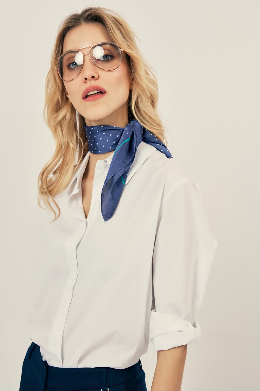 Он смотрится поистинре привлекательно. Платки подвязывают под самое горло в несколько оборотов, выпуская только два треугольника. Или можно сделать более свободный вариант, повязав в виде галстука.