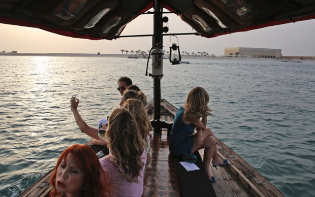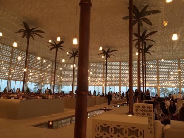 До острова, который Карл Лагерфельд арендовал специально для показа, гости добирались на весьма колоритных лодках. Отсутствие настоящих пальм на территории ничуть не смутило организаторов шоу, и они решили эту проблему с помощью искусственных, под которыми на удобных низких сидениях расположились вип-гости. Настоящая арабская атмосфера роскоши и неги прослеживалась и в самой коллекции, которая создавалась с упором на арабскую культуру. Именно поэтому круизные наряды максимально закрытые и напоминают часто наряды из "1001 ночи". Впрочем, посмотрите на все сами.