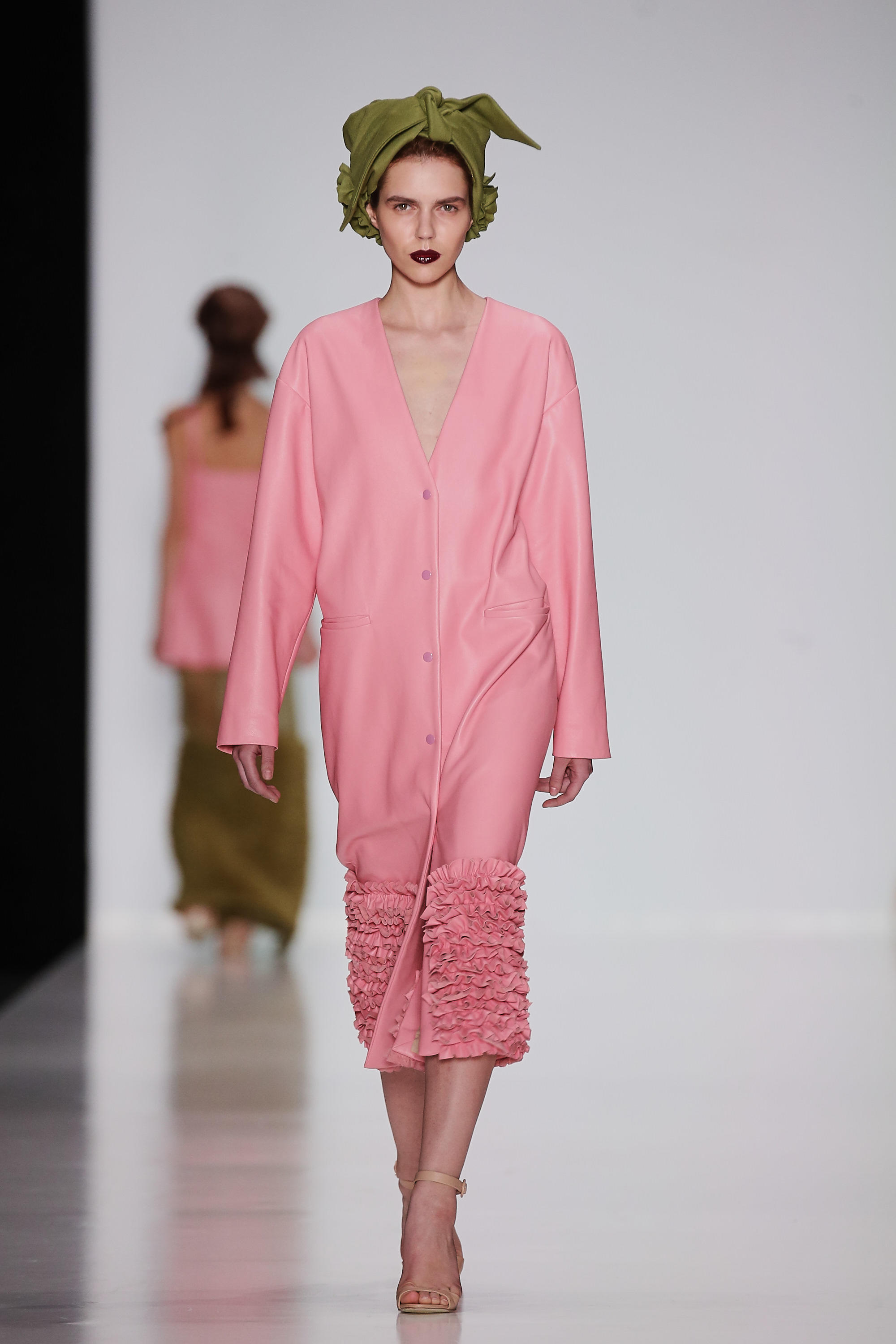 Новая коллекция бренда Ruban включала в себя все отличительные составляющие модного бренда: сложный крой и неожиданные решения. Многоярусные трапецевидные платья с россыпью мелких воланов, крупные накладные карманы с отделкой из меха песца и короткие фартуки, надетые поверх пальто, прямых брюк, или платья-бюстье. Прозрачные ткани, прямые, а-образные силуэты и, конечно, пальто, ставшие одной из визитных карточек марки: на этот раз из цветной кожи и кашемира. Асимметричный шерстяной свитер фактурной вязки с открытым плечом – один из самых интересных и универсальных элементов коллекции. Основные цвета линии: фисташковый, тепло-розовый, оливковый, кремовый и лиловый.