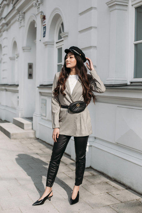 4. Пиджак с объемными плечами и поясная сумка.