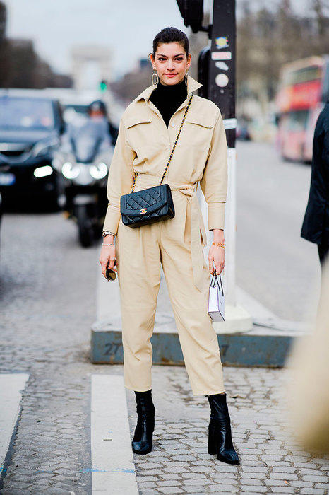 1. Комбинезон с большими карманами в сочетании с остроносыми сапогами.