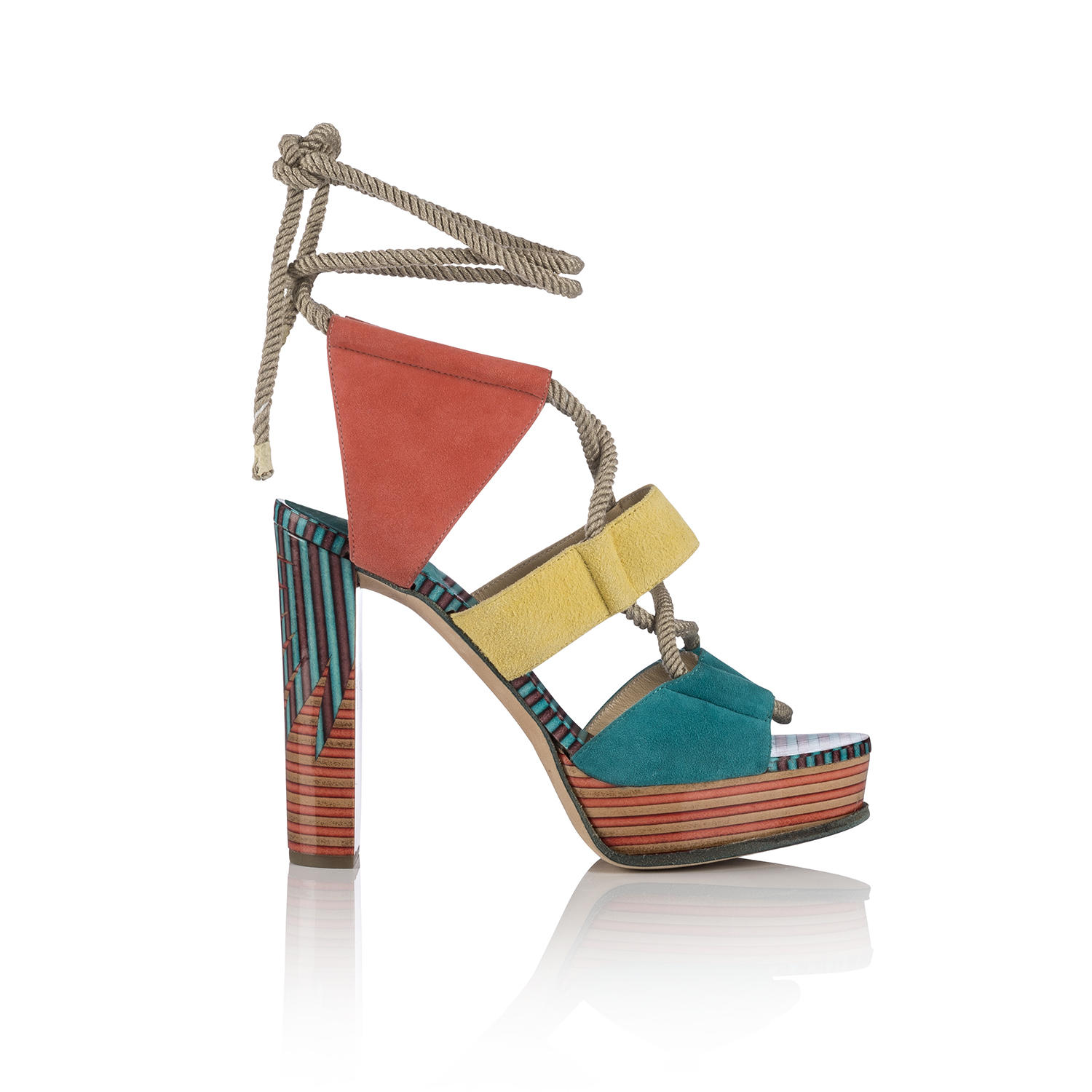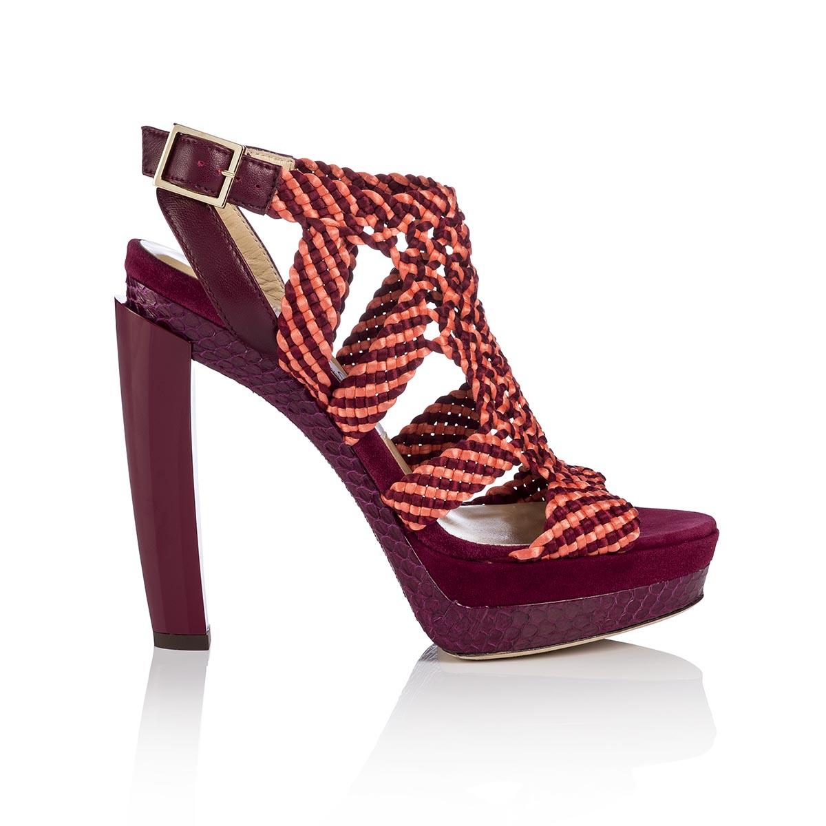 Сандалии трансформируются в туфли на каблуке или обувь на танкетке, украшенную ручным плетением. Платформа выполнена из пробкового дерева, а каблук – из оргстекла. Завершающими деталями являются тонкие ремешки, которые застегиваются на лодыжке, шнуровка и аппликации в виде пальм. Коралловый цвет и цвет морской волны доминируют в босоножках, клогах и пляжной обуви, в то время как сапоги в ковбойском стиле, эспадрильи и балетки выполнены в замше цвета хаки или в металлической коже.