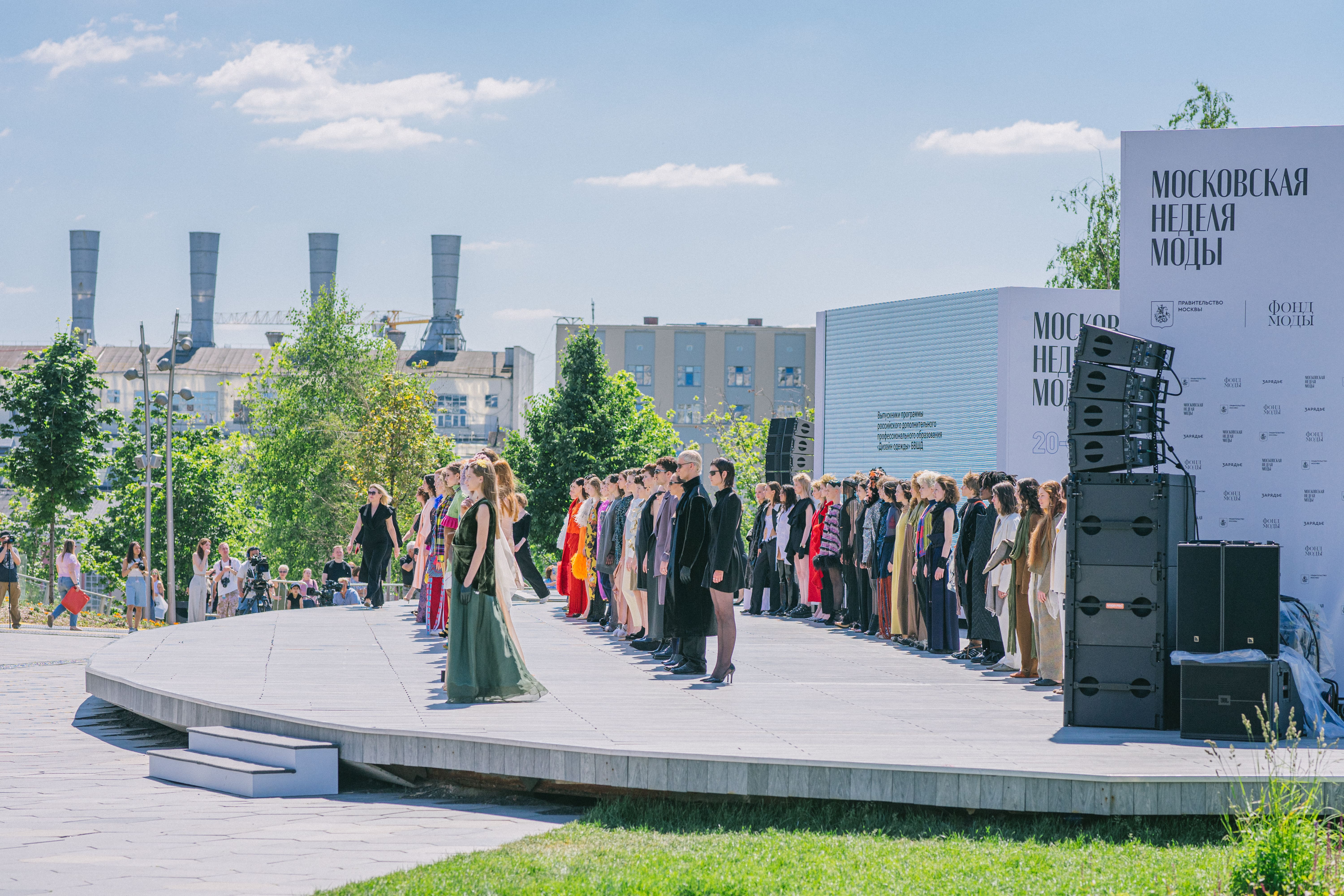 Череду показов пятого дня Московской недели моды в «Зарядье» открыл коллективный показ выпускников Британской высшей школы дизайна, который прошел в Большом амфитеатре парка. Также на площадке свои коллекции представили еще 9 дизайнеров: SASHINA DESIGNER LABEL, SOL ANGELANN, BEENA, 1377, Measure, Gerda Irene, VICTORIA ANDREYANOVA, Sasha Gapanovich и SHATU 1997.