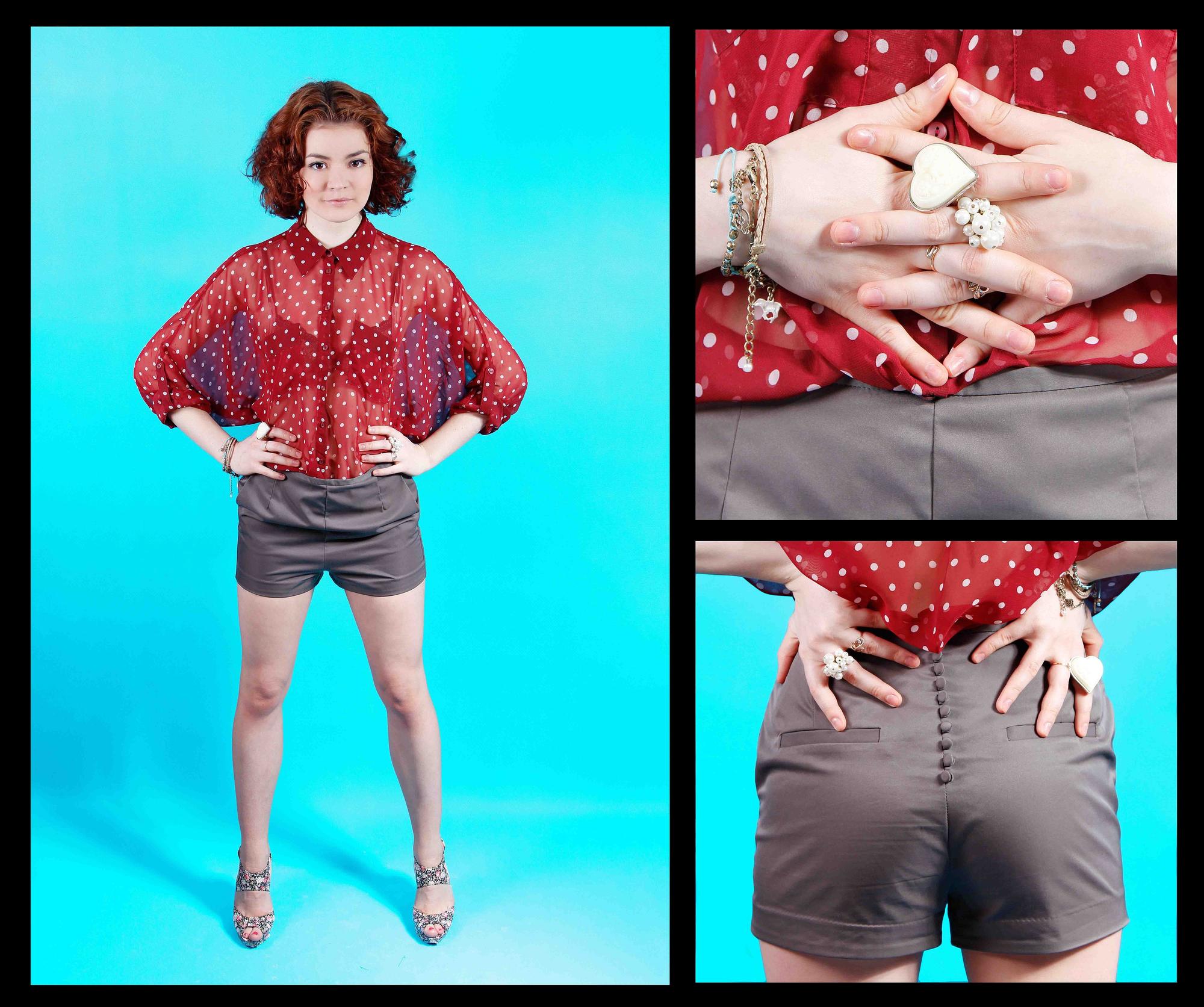 АГ: Шифоновая рубашка в горошек и шортики с игривыми пуговичками. Так я бы оделась для веселых домашних посиделок с моими друзьями.