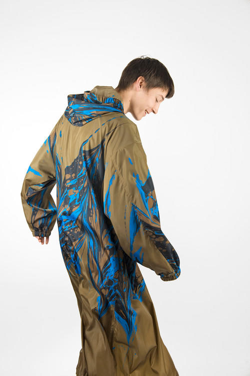 В линию дождевиков вошли десять моделей с разными мраморными принтами. Они выполнены в турецкой технике Эбру — рисунок наносится на поверхность воды красками на масляной основе. Всего дизайнер сделал 300 таких принтов, среди которых отобрал десять лучших. Коллекция появится в продаже в августе — каждая модель в десяти экземплярах.