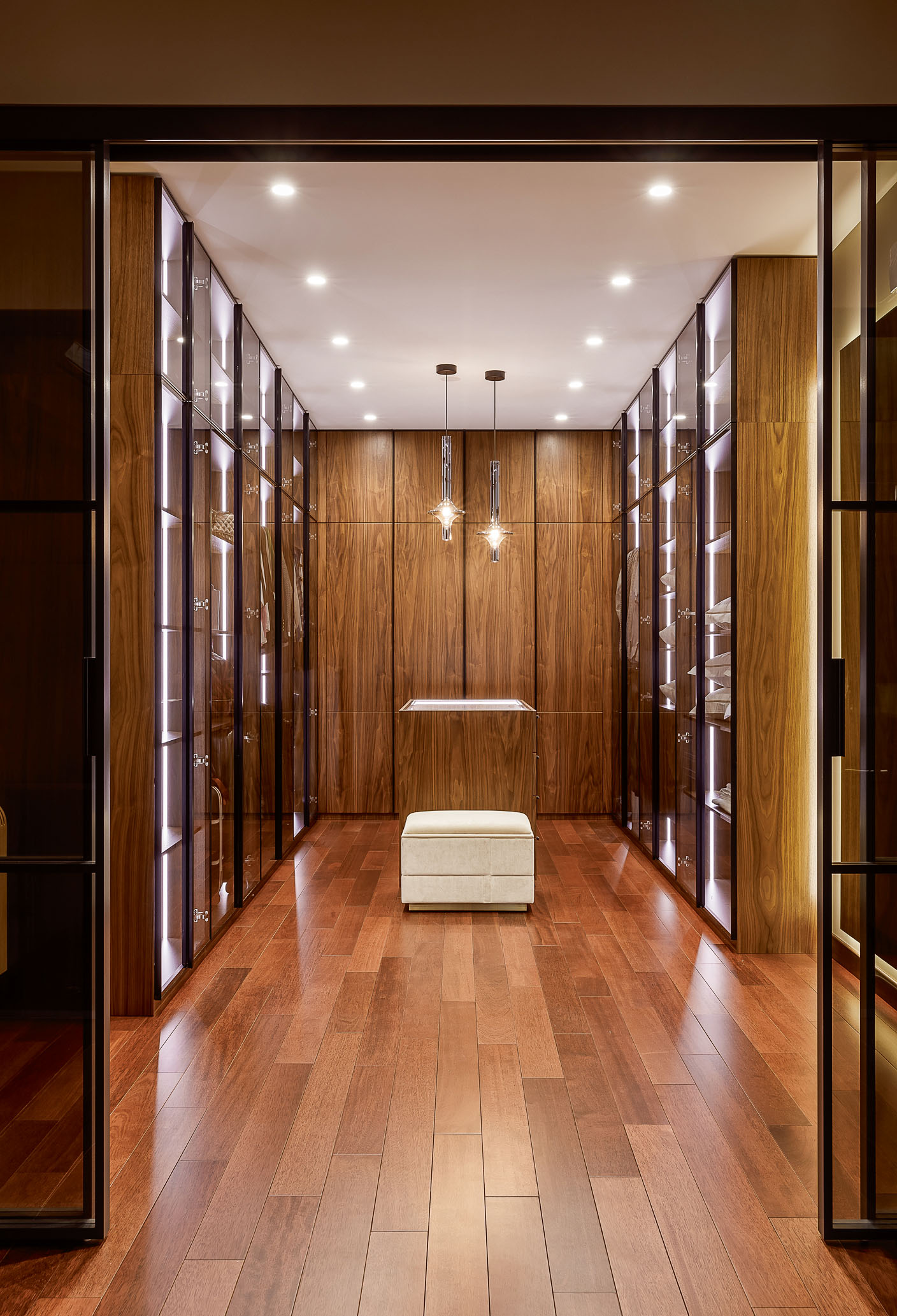 В качестве напольного покрытия был выбран не просто паркет из натурального дерева, а экзотическая редкая порода мербау, которая отлично сочетается с американским орехом на стеновых панелях, дверях, в отделке гардероба. Древесные фактуры придают интерьеру теплоту и особую утонченность.