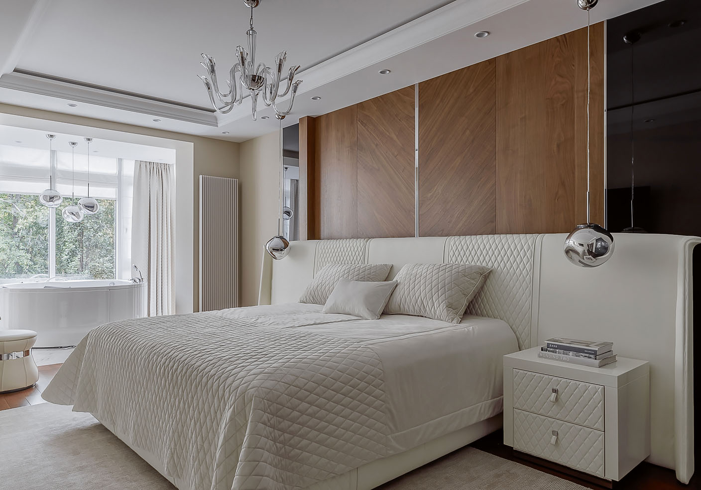 После масштабной перепланировки была выделена мастер-спальня, зона отдыха для гостей с баром, гардеробная, санузел и другие вспомогательные помещения. Особым элементом стало джакузи, которое разместилось на лоджии с видом на красивый парк и фонтан.