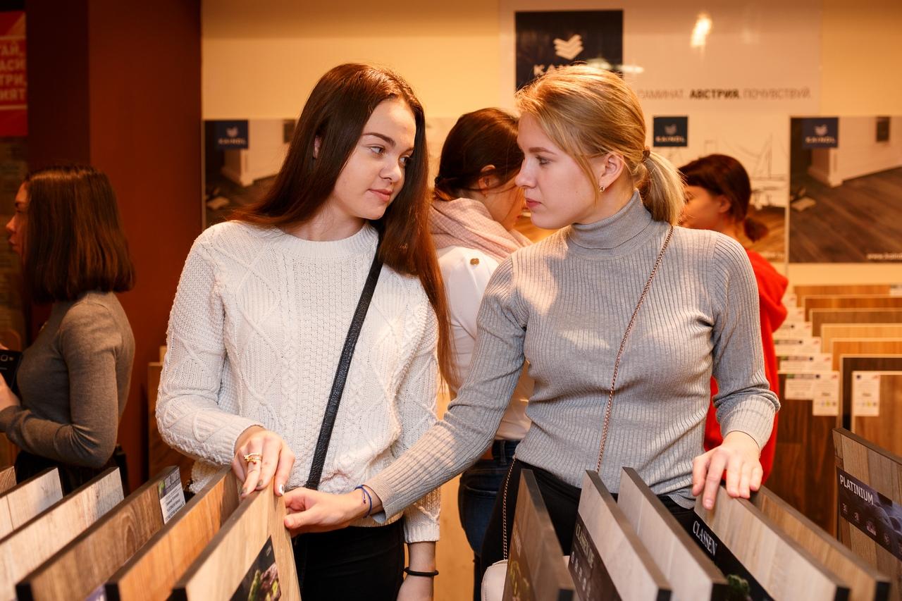 В салоне напольных покрытий Home Comfort прошел день открытых дверей. Студенты Воронежского Государственного Технического Университета под руководством Сергея Владимировича Барбарина, архитектора, доцента кафедры дизайна, познакомились с ассортиментом магазина, разобрали кейсы и изучили опыт применения различных материалов (напольных покрытий, декора стен, климатической техники) при проектировании домов.
