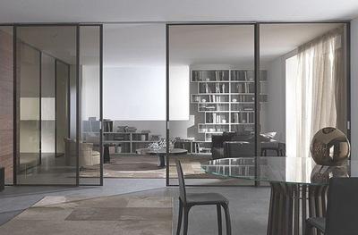 Также стали очень популярными стеклянные перегородки. Это один из самых популярных способов разделения пространства. Стекло можно оставить прозрачным, а можно сделать матовым. Это отличный способ разграничения зон, однако, в отличие от гипсокартонных конструкций, стекло пропускает свет - и в вашей комнате всегда светло и уютно. Это может быть стационарная перегородка, а может быть - стеклянная дверь.