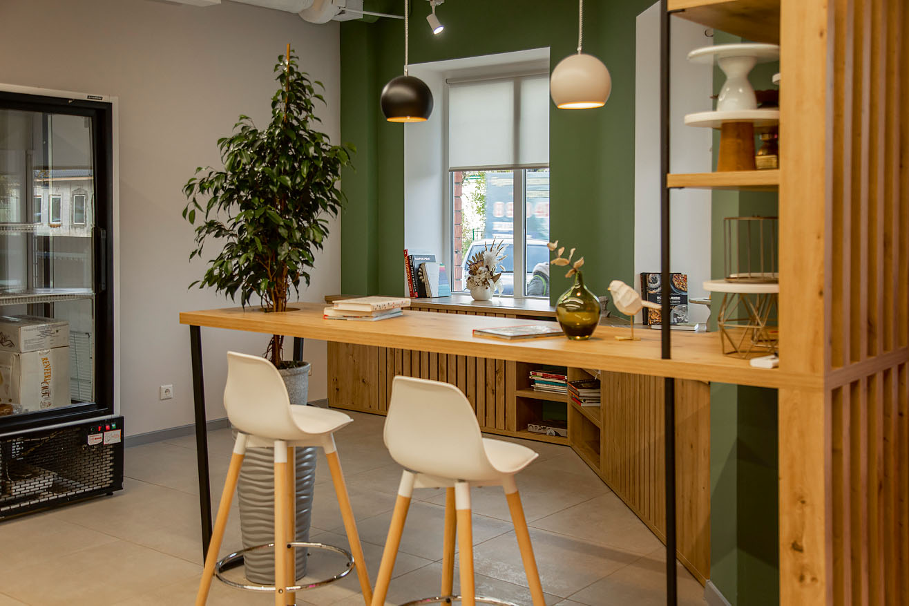 На входе в школу расположена зона ресепшена с витриной необыкновенных десертов собственного производства и вкусным кофе. В комнате студентов находится большой обеденный стол, который служит еще и местом для проведения планерок и переговоров. В учебном классе можно проводить как мастер-классы, так и лекции, используя проектор. Здесь есть большая кухонная зона со всем необходимым оборудованием и техникой. А еще уместилась барная стойка, за которой можно выпить кофе и обсудить содержание книг — они находятся тут же, в компактной библиотеке. Ее хозяйка пополняет с особым трепетом.