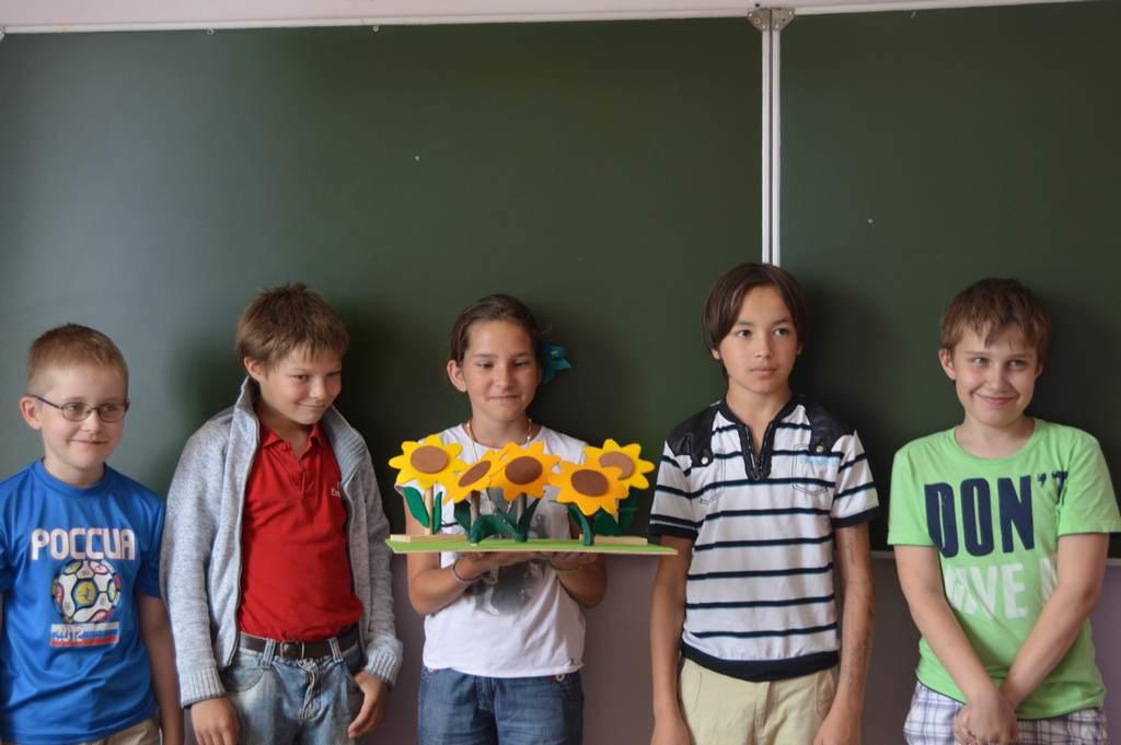 Наконец, поляна подсолнухов готова, ребята хорошо потрудились и узнали много нового. За время работы дождик прекратился, тучи за окном рассеялись, выглянуло солнце. У ребят появилась возможность порадоваться результатам своего труда.