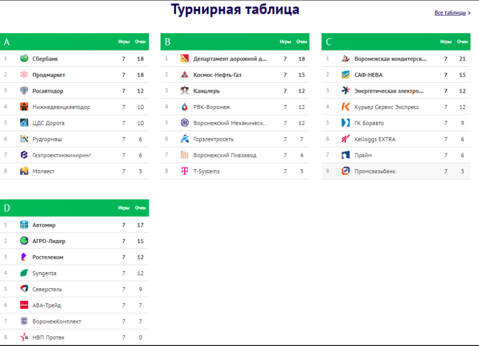 Итак, в дивизионе «А» победу в регулярном чемпионате отпраздновал «Сбербанк», дожавший «Продмаркет» (2:1), «Рудгормаш» продолжил свою серию «неудач», уступив «ЦДС Дорога» (0:3), «Нижнедевицкавтодор» разгромил «Газпроектинжиниринг» (6:1), а «Молвест» победил «Росавтодор» (4:0).