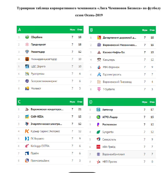 «Лига Чемпионов Бизнеса»- самое массовое корпоративное спортивное движение в России, не имеющее аналогов. В структуре проекта регулярные чемпионаты по разным видам спорта среди сотрудников из различных сфер бизнеса. Система проведения чемпионата основана на делении команд по дивизионам в зависимости от уровня спортивной подготовки. Этот принцип позволяет любой команде бороться за призы в своей «весовой категории».