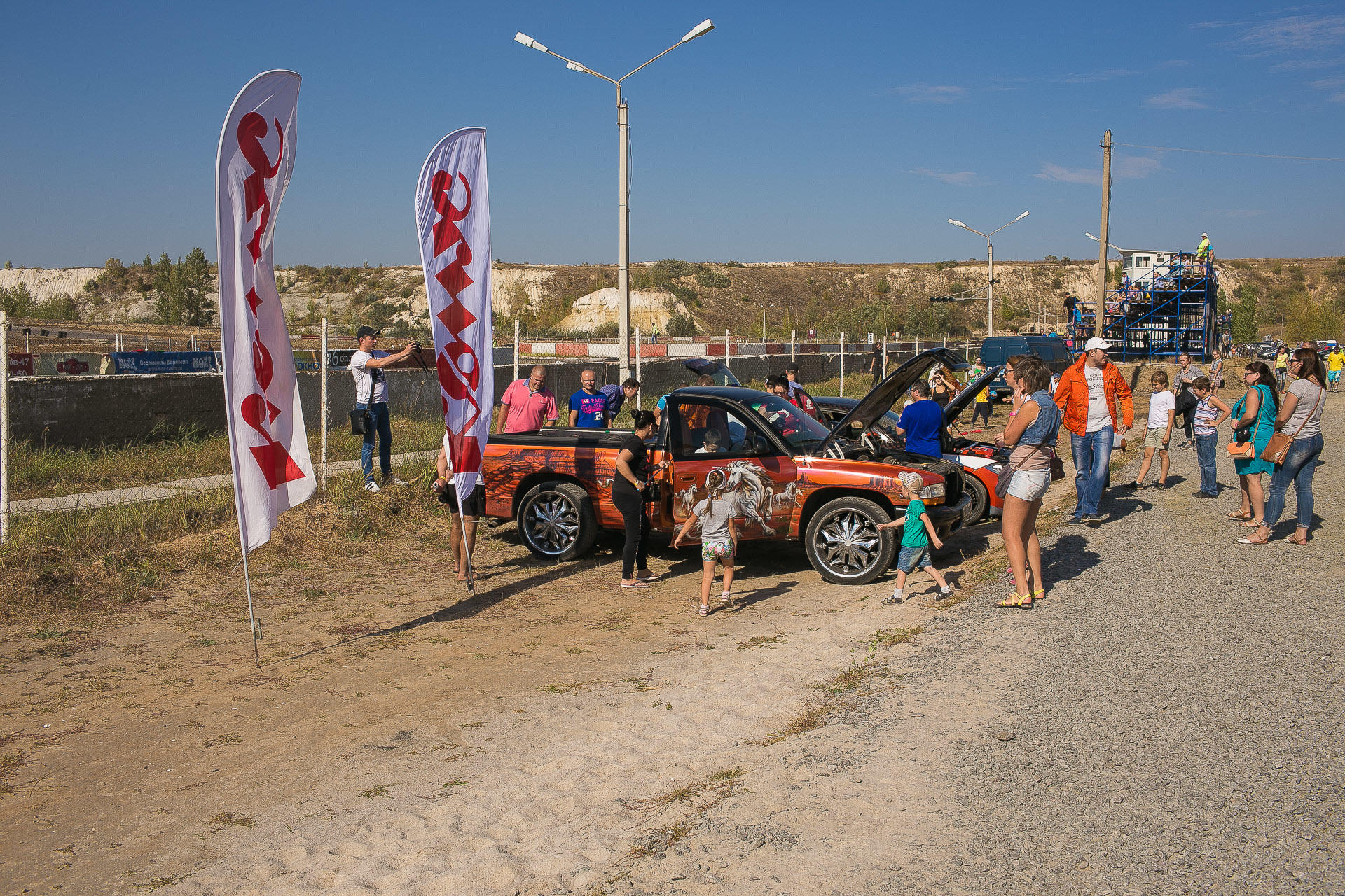 На территории парковки все ценители хорошей и качественной музыки в автомобиле могли насладиться хорошим звуком в машинах Додж и БМВ 1 от магазина «Скорость Звука».