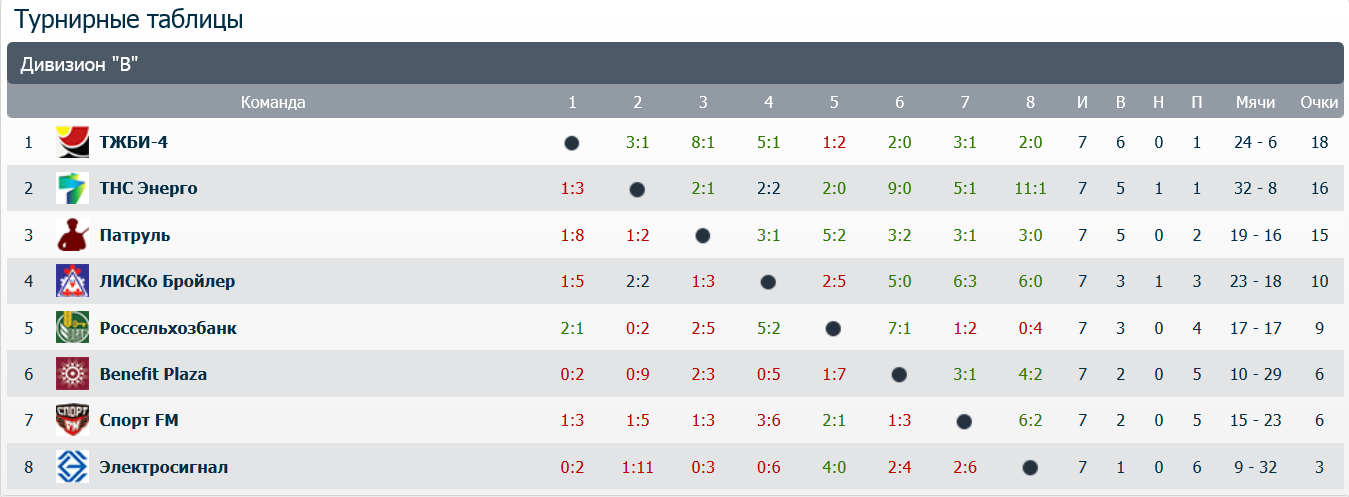 В Дивизионе «В» «ЛИСКо-Бройлер» в матче с «ТНС Энерго» сумел избежать третьего к ряду поражения - 2:2. «Патруль» с минимальным перевесом в счете одолел «Benefit Plaza» - 3:2. А «ТЖБИ-4», проиграв «Россельхозбанку» со счетом 1:2, стал автором главной сенсации заключительного дня группового этапа соревнований. «Электросигнал» же, уступив «Спорт FM» - 2:6, так и остался на последнем месте в своем дивизионе.