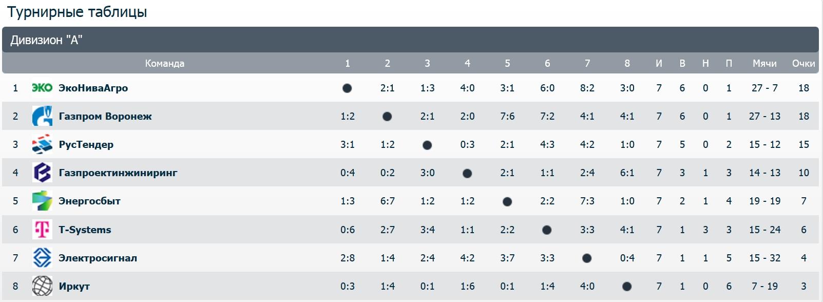 В «Кубке 1» «Газпром Воронеж» был сильнее «ЭкоНиваАгро» - 4:0. Газовики собрались на матч с лидером Кубка и сумели победить, после разгромного поражения в прошлом туре. Прогноз по взлетевшему «Русавиаинтеру» себя оправдал. Сбить их не удалось. Результат: уверенная победа над «РусТендером» - 5:0. В итоге - золотой триумф «ЭкоНиваАгро», серебряный полет «Русавиаинтера» и бронзовая поступь «Газпром Воронеж».