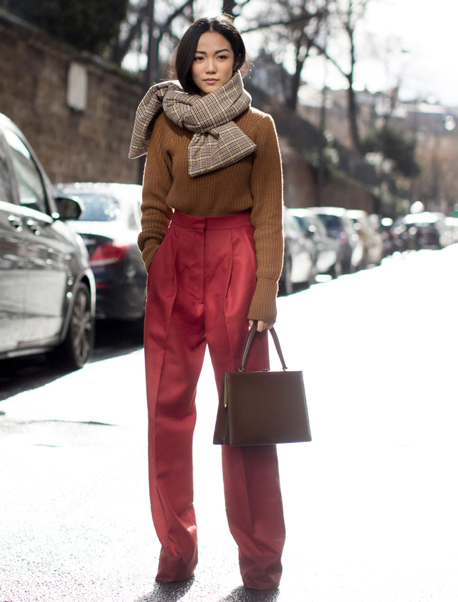 С широкими или прямыми брюками и юбками длины миди, однако подойдет лишь девушкам с высоким ростом и неширокими плечами. Можно подбирать женственные ткани и расцветки, даже сезонно-осенние.