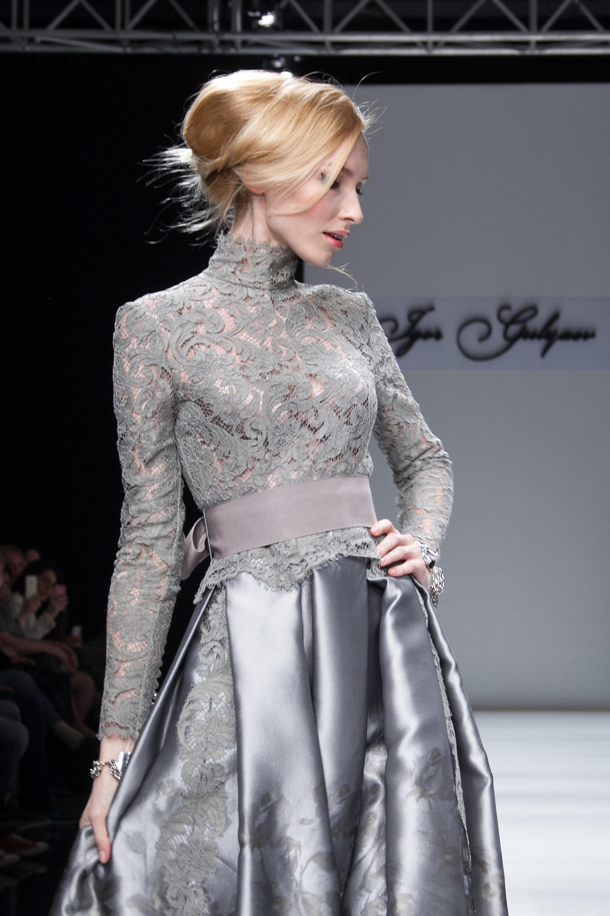 Изысканная фактура, глубокие цвета и роскошные материалы – мех, бархат, парча. Образ от Игоря Гуляева отразил в себе лаконичность дореволюционного русского стиля и европейский модерн. Коллекция полна сочных оттенков: изумруд, индиго, пурпур, бордо, бирюза, аквамарин – такая богатая гамма вызывает прямые ассоциации оттенками драгоценных камней. Платья, пальто, меховые изделия, блузы и юбки, составляющие основу коллекции, в тандеме рисуют образ на грани классики и авангарда.