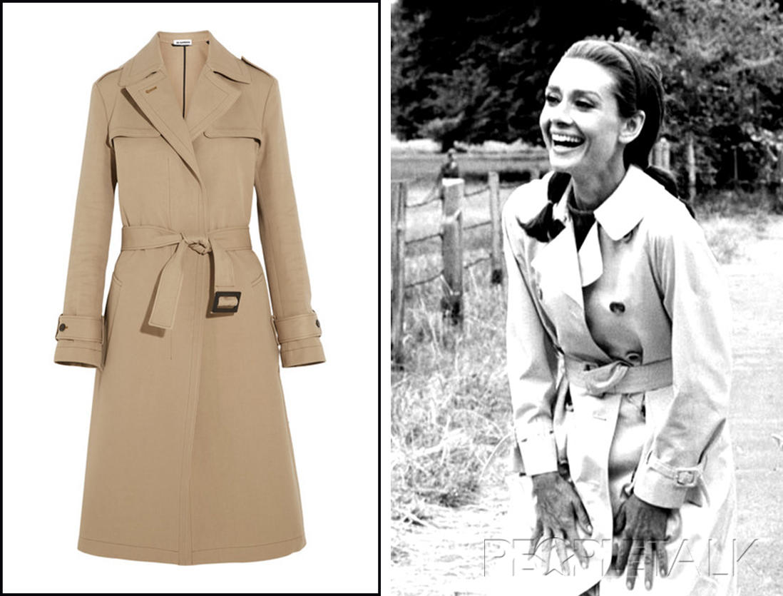 Обязательно бежевый. Женственный, изящный крой верхней одежды не требует дополнительных аксессуаров. Одри надевала тренчкот поверх платьев, юбок или брюк в сочетании с балетками.