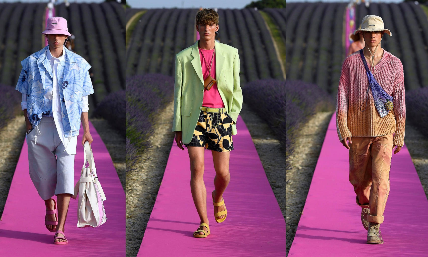 Крошечные сумки в этот раз стали еще меньше, аксессуары — еще интересней. Модели ходили по подиуму с брелоками в виде початков кукурузы и лимонов, украшенных кристаллами Swarovski. На одну из рубашек Жакмюс поместил принт картины Поля Сезанна. “Пейзаж в пейзаже. Сезанн в лавандовом поле”, — рассказал дизайнер в историях в инстаграме. В коллекцию также вошли огромные соломенные шляпы, босоножки на тонких ремешках и поясные сумки, знакомые с прошлых сезонов.