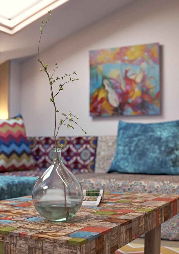 Цвет всегда воспринимается в контексте окружающей среды и освещения: вид за окном и количество света, попадающего в помещение. Так, некоторое время назад в моде были нюдовые, пудровые интерьеры. Они действительно шикарно смотрятся на широте лазурного берега Франции, где много солнца, и блики играют на всех поверхностях. Но перенося эту палитру в наш регион, такую картинку мы получаем максимум на 1-2 месяца в году: особенности климата вносят свою лепту. В хмурое время года так хочется добавить в жизнь ярких красок! Однако не все готовы жить в ярких стенах. В этом случае есть прекрасное решение — детали, которыми можно играть. Это подушки, кресла, часы, светильники, вазы, скульптуры, картины… Они могут быть какой угодно степени яркости. Причем, чем меньше деталь, тем более красочной она может быть, позволяя себе отклонения от общей концепции. Но цвет — это не всегда решающий фактор: деталь может быть яркого содержания.