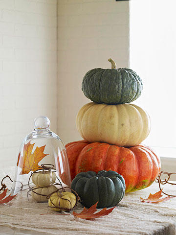 Тыква- один из самых интересных предметов для декора,особенно в канун Хеллоуина. Из нее делают все что угодно: вазы, фонари, подсвечники. Благодаря разным формам,цветам и размерам, можно соорудить тыквенные горки,соединив их между собой шпажками, а украсить всю композицию листьями,искусственными божьими коровками или прутьями.