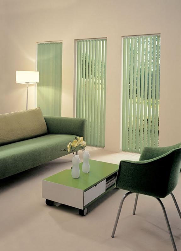 Если горизонтальные пластмассовые жалюзи больше подойдут для офиса, то для дома можно выбрать их аналог с вертикальными тканевыми планками. Вертикальные имеют особенность - потянув шнур, вы можете либо сложить все планки вместе — «закрытое состояние», либо наоборот, растянуть их вдоль всего окна. Здесь также возможно вращение планок при помощи специального механизма, находящегося в карнизе.