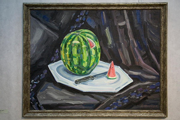 В экспозиции представлено более 60 произведений. В состав выставки вошли как ранние работы, созданные в 1970-х годах, так и написанные совсем недавно. В экспозиции присутствуют все жанры, в которых работает художник – пейзаж, натюрморт, аллегорические полотна.