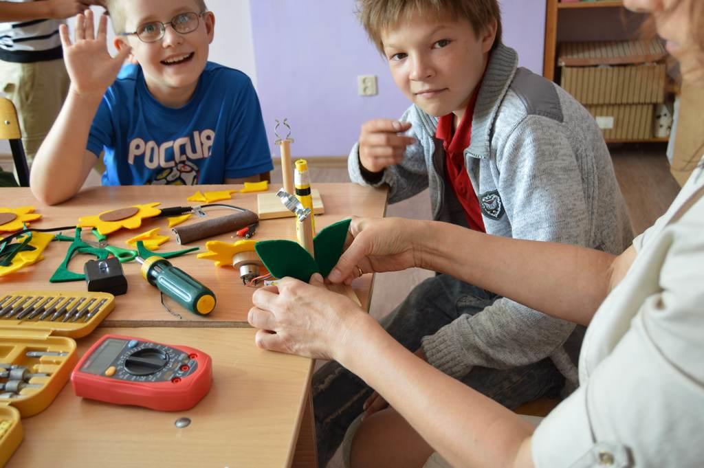И вот, началось самое интересное — ребятам предстояло своими руками изготовить подсолнух, который поворачивался бы при освещении его солнечным светом. Такое название цветку дано неслучайно. Огромные соцветия, и впрямь напоминают солнышко. Кроме того, это растение обладает уникальной способностью поворачивать свою верхушку вслед за солнцем, прослеживая весь его путь от восхода до заката. Фетр, моторчик, солнечная батарея и, конечно, умелые руки — потребовалось немало старания и смекалки, чтобы получился замечательный цветок.