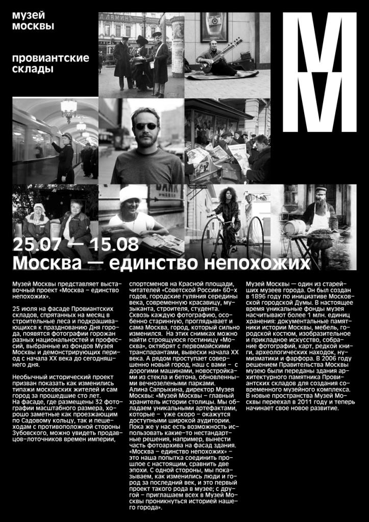 Алина Сапрыкина, директор Музея Москвы: «Музей Москвы – главный хранитель истории столицы. Мы обладаем уникальными артефактами, которые – уже скоро – окажутся доступными широкой аудитории. Пока же у нас есть возможность использовать какие-то нестандартные решения, например, вынести часть фотоархива на фасад здания. «Москва – единство непохожих» - это наша попытка соединить прошлое с настоящим, сравнить две эпохи. С одной стороны, мы показываем, как изменились люди и город за последний век, и это первый проект такого рода в музее; с другой - приглашаем всех в Музей Москвы проникнуться историей нашего города».