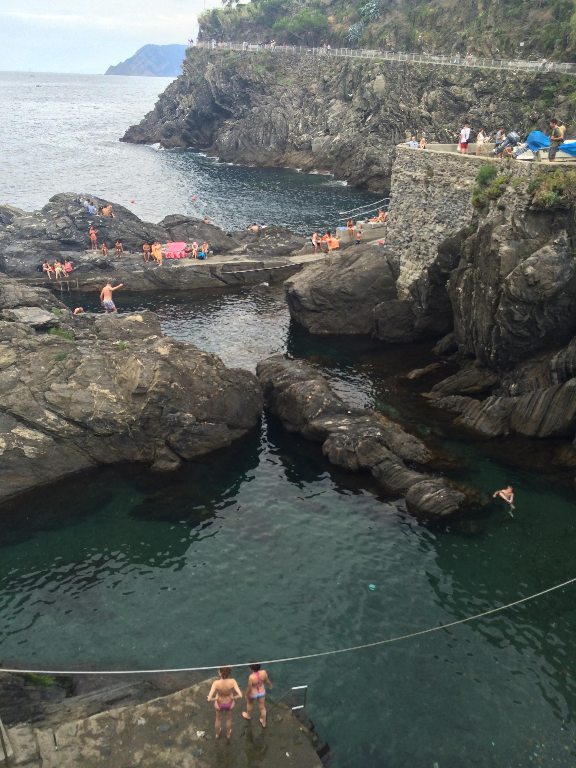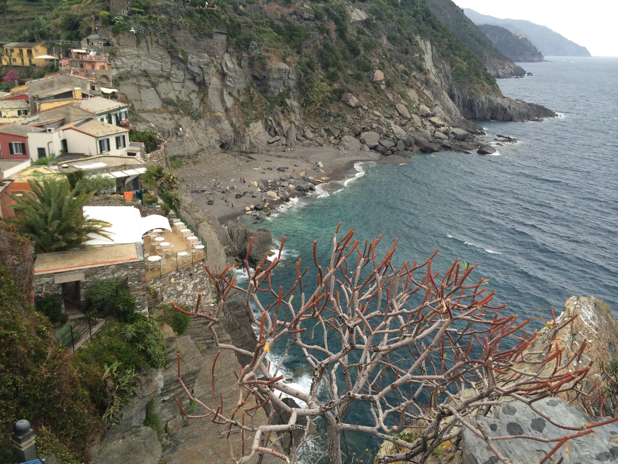 В Вернацце отдыхающие предпочитают лежать прямо на скалах, а спускаются в море с помощью небольших лесенок. Деревушка Корнилья вообще не имеет как таковых выходов к морю, поэтому мимо нее все корабли проплывают мимо. Если хотите искупаться, то можно порекомендовать шикарный галечный пляж в Монтероссо. Большой, красивый, с чистейшей водой, он привлекает сюда очень много народу. Но за удовольствие надо платить около 15 евро в сутки за человека. В стоимость сходит пользование лежаками, зонтиками, полотенцами. Монтероссо, кстати, знаменит не только своим пляжем, но и сам городок очень интересный. Историческая его часть находится не на берегу моря, а чуть дальше. Когда ты забираешься на гору, то кажется, будто домики это деревни утопают в самих горах. Сказка! Кстати, наверху находится великолепная церковь и типичное европейское кладбище, на которое с первого раза и не подумаешь, что это кладбище вообще.