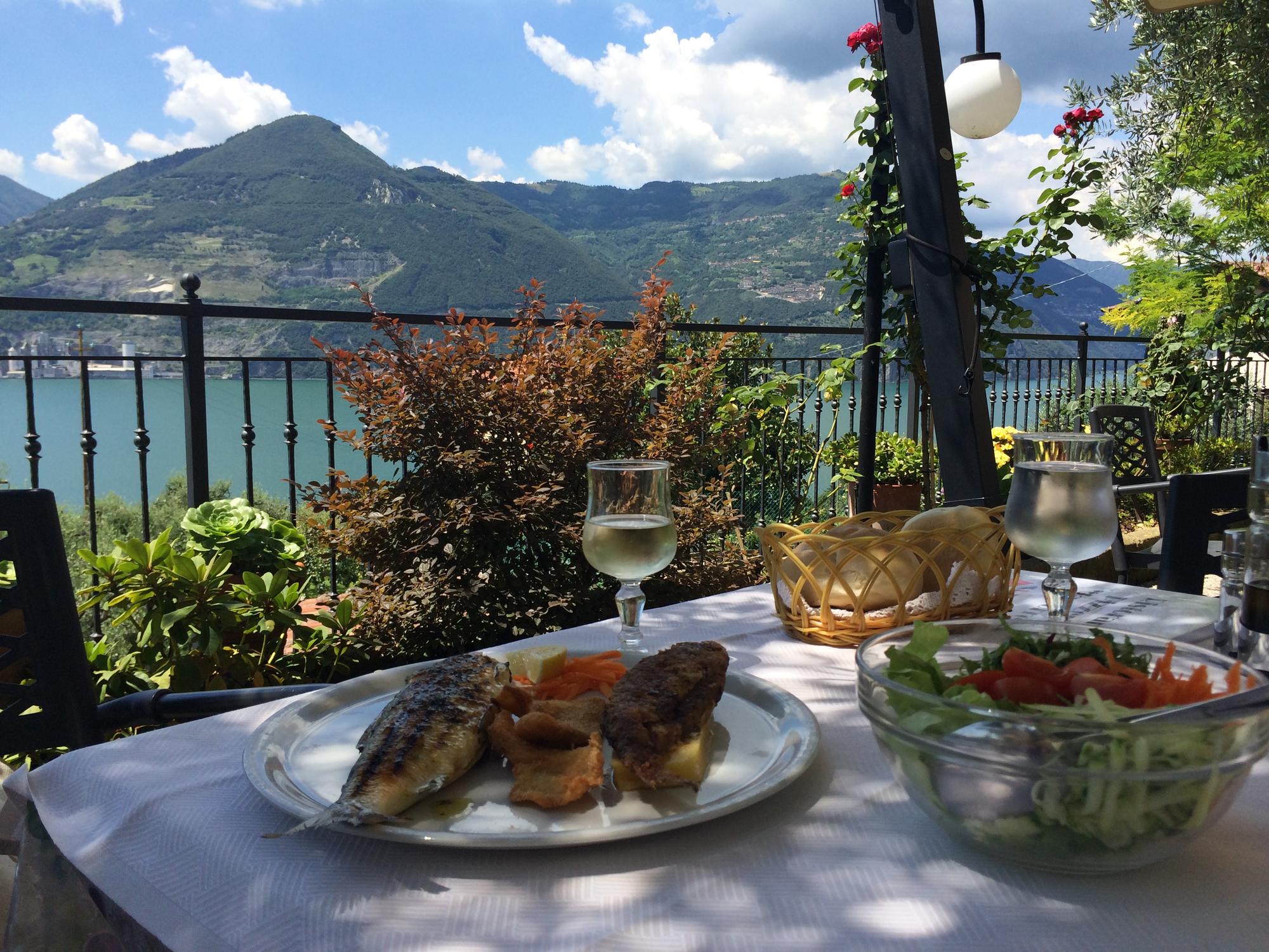 Вообще, отдых в Италии – это Dolce Vita. Ни в одной стране мира вы не прочувствуете эту самую Vita, кроме как в Италии. И огромную роль в ней играет, конечно же, кухня. Признаться, раньше я не очень любила итальянскую кухню. Ну, как-то не сложилось у меня с ней. Помнится, в первый раз в Риме решила попробовать традиционные блюда – лазанью, тирамису, пиццу. И как-то ну совсем не понравилось. Вроде и в «кулинарном» районе Трастевере дело происходило, и место не туристическое, но все равно что-то не то. С тех пор честно, я пыталась полюбить ее в следующие поездки в Италию, но все было тщетно. И вот, наконец, это свершилось. Я поняла почему не получалось раньше – просто не те места были, а может, и не те города… Слишком туристические. Тут же – настоящий рай для гурманов. Вы можете зайти в любое кафе. Абсолютно любое, и выбрать абсолютно любое блюдо. И вам принесут шедевр. Огромный, невероятно вкусный, сытный, после знакомства с ним вы на всю жизнь влюбитесь в итальянскую кухню. Итак: брускетта, пицца, рыба, выловленная прямо из озера, сардины, покоящиеся на прекрасной поленте, свежайшие салаты, невероятное тирамису, буратта, салями, брезаола, осьминог с песто и многое-многое другое.