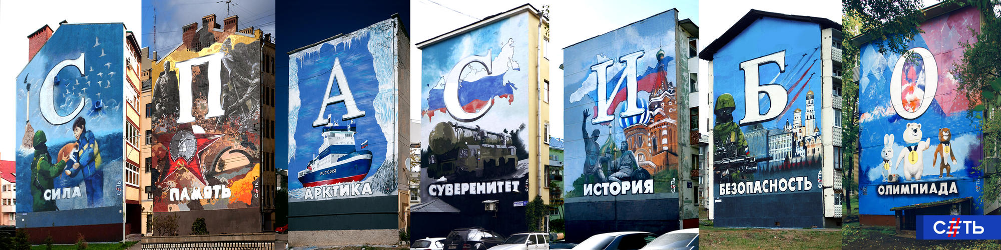 Каждая работа выполнена на фасадах многоэтажных домов. В каждом городе своя буква, с которой начинается слово, имеющее символическое значение для нашего поколения. «С»-сила, «П»-память, «А»-Артика, «С»-суверенитет, «Б»-безопасность, «О»-олимпиада.