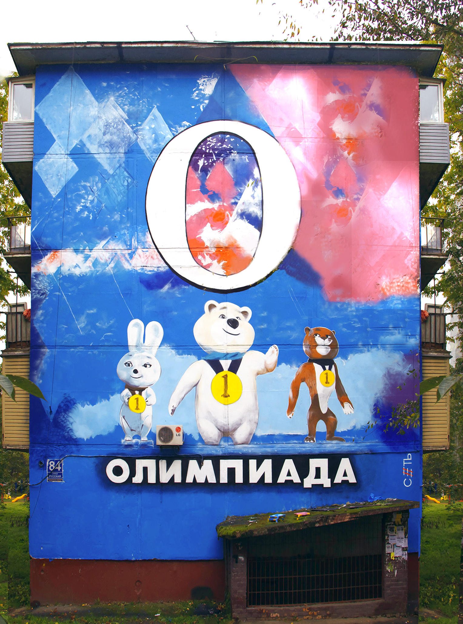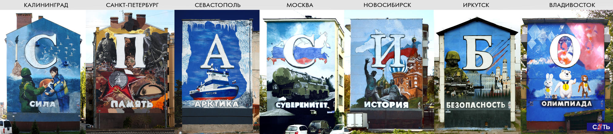 «За последнюю неделю на фасадах домов в Калининграде, Санкт-Петербурге, Севастополе, Москве,Новосибирске, Иркутске и Владивостоке появились огромные граффити со словами:Сила, Память, Арктика, Суверенитет, История, Безопасность и Олимпиада, олицетворяющими современную Россию.