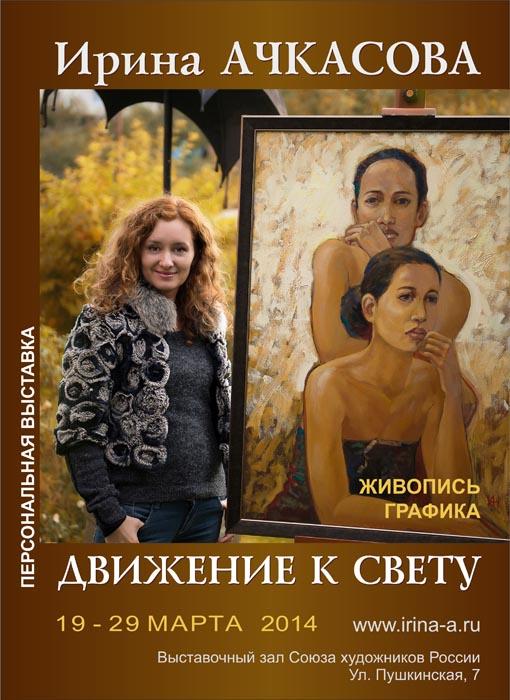 Тематика работ разнообразна. Большой цикл картин посвящен Индонезии и жизни острова Бали. Также представлено много полотен с русской природой. Третье тематическое направление составляют портреты. Все картины наполнены творческим осмыслением красоты жизни, гармонии природы и человека, людских судеб и загадок. Известный воронежский художник Алексей Загородных отметил: «Самым важным в искусстве является правда чувства. Глядя на произведения Ирины Ачкасовой, понимаешь, что такое «красивость» и что такое подлинная красота. «Движение к свету» - это, бесспорно, интересная, живая, красочная экспозиция, где каждый сможет найти работу, которая оставит незабываемый след в душе».