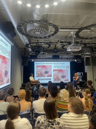 Гостья объяснила слушателям особенности работы дизайнеров и препрессчиков – оказалось, эти профессии затрагивают разные этапы разработки будущей книги. Задача дизайнера – разработать композицию готовой книги, доведя ее до идеала. Препресс же отвечает только за техническую часть, например, макеты, под стандарты которых должны подходить иллюстрации и графические элементы. «Идеальная работа препресса – если вы не заметили, что мы прикасались к работе», – отметила Валерия Федорова.