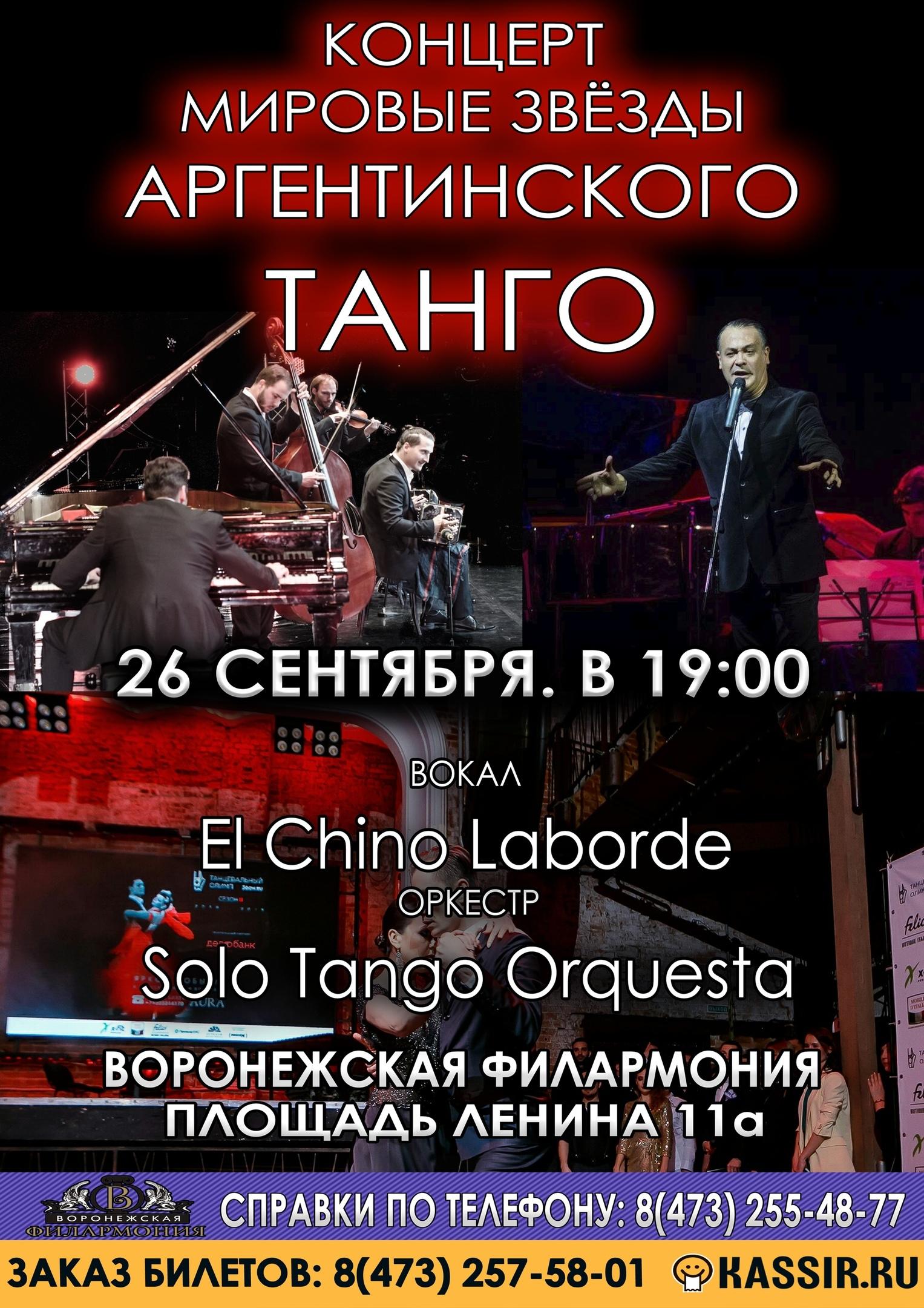 Звездный союз Solo Tango Orguestra с Вальтером Чино Лаборде нередко воплощает на сцене великую музыку иконы ХХ века, Астора Пьяцоллы. Концерт "Мировые звёзды аргентинского танго" - это уникальная возможность прикоснуться к легенде.