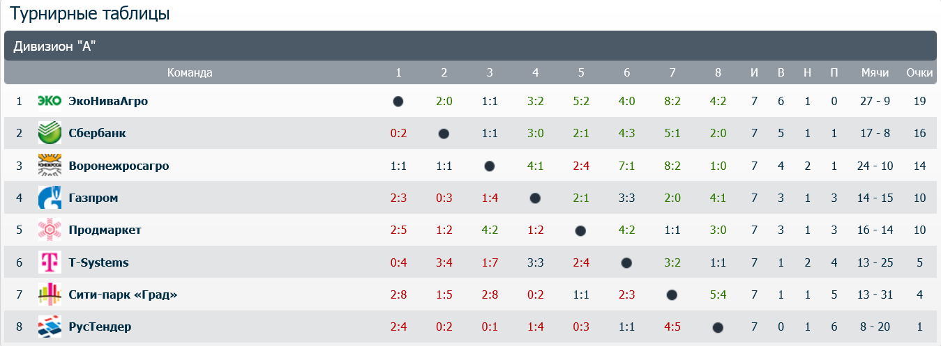В Дивизионе «А» игроки «Воронежросагро» в поединке с коллективом «Сити-парк «Град» от души покуражились в атаке - 8:2. А особо отличился Денис Дубровин, поражавший ворота противника пять (!) раз. Голевая перестрелка в споре «Газпрома» и «T-Systems» завершилась боевой ничьей - 3:3. «Сбербанк» на последних секундах встречи вырвал победу у «Продмаркета» - 2:1. «ЭкоНиваАгро» довольно скромно, по лидерским меркам, обыграла занимающий последнее место «РусТендер» - 4:2.