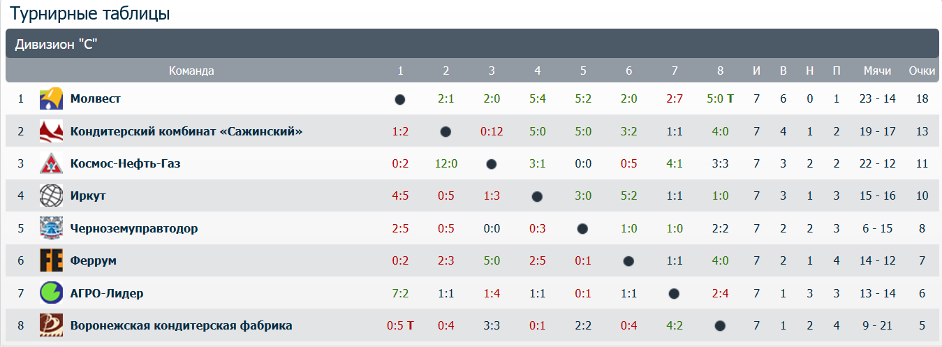 В Дивизионе «С» команда «Воронежской кондитерской фабрики» практически без вариантов уступила усилившемуся по ходу турнира «Ферруму» - 0:4. «Иркут» и «АГРО-Лидер» в каждом из таймов забили по мячу и разошлись миром - 1:1. «Молвест» при активной поддержке своих болельщиков в игре доказал, что достоин первого места больше, чем футболисты «Кондитерского комбината «Сажинский» - 2:1. А коллектив «Черноземуправтодор» в третьем туре подряд сохранил свои ворота на замке, правда, и в свой актив голов в поединке с командой «Космос-Нефть-Газ» не записал - 0:0.