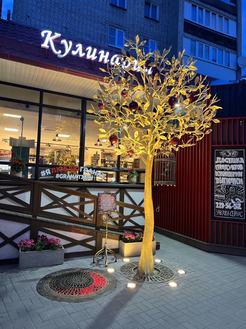 Трехметровое дерево выполнено из позолоченного металла, а его ветви украшают спелые плоды граната. Надпись на табличке, сопровождающей стильную композицию, гласит: «По легенде, первое дерево граната посадила богиня любви Афродита в память о своем возлюбленном Адонисе. Цветы граната олицетворяют страстную любовь, а плоды – супружескую верность и крепкую семью. Встаньте под это дерево вместе с любимым человеком, вспомните самый яркий момент между вами, верьте в чудо, и к вам придет безграничное счастье в отношениях».