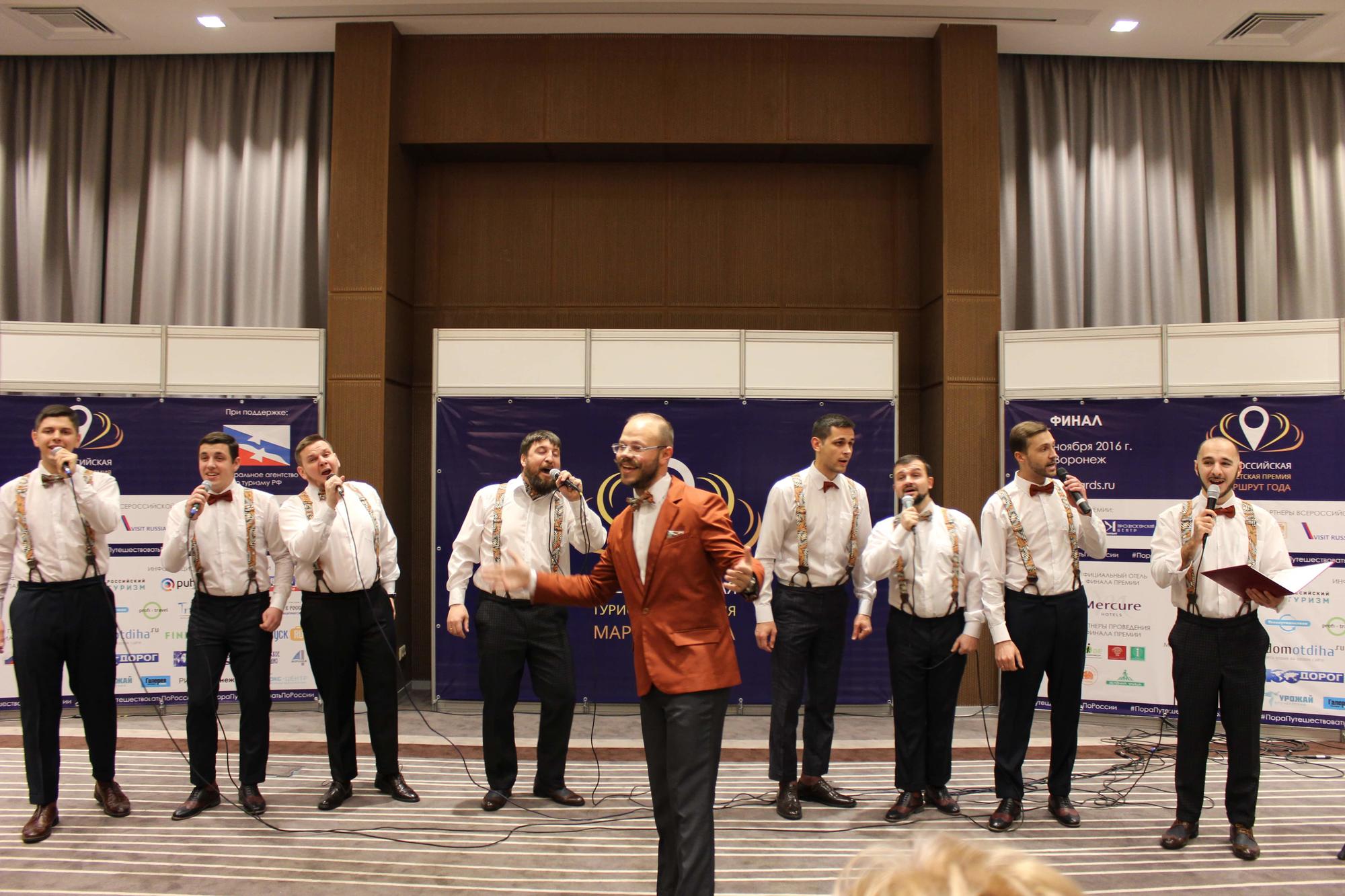 На протяжении всей церемонии для гостей Воронежа лучшие отечественные и зарубежные композиции акапельно исполнял мужской хор Воронежского концертного зала.
