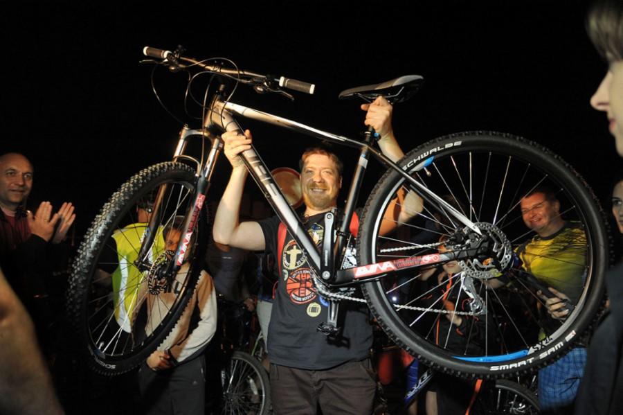 Выиграть один из нескольких велосипедов на финише мог каждый, кто заполнил анкету и получил регистрационную наклейку на старте велопробега. Таким образом новый байк получили люди, которые проехали весь маршрут Велоночи.