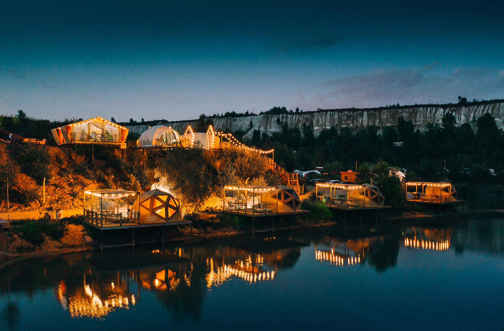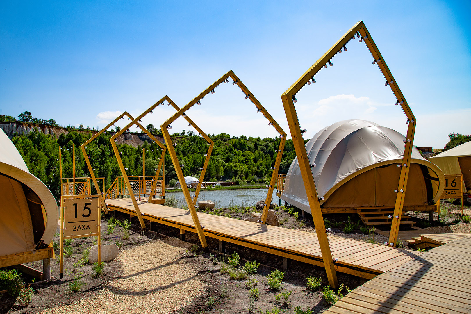 Глэмпинг был открыт в 2022-м году и уже принял 5000 гостей. Жюри высоко оценили разноуровневое пространство, реализованное деревянными террасами вокруг озера. За счет этого из каждого домика открывается вид на озеро и белые горы. Сами домики — быстровозводимые глэмпы разных моделей, включая первые в России типа «Заха». Террасы, верхние и нижние «этажи» соединяет система деревянных лестниц. Некоторые домики оснащены деревянными верандами над озером. Кроме функциональных зон, есть несколько креативных пространств из дерева: чайная зона «дВЕРЬ в мечту» с огромным плетеным «гнездом» из натуральных прутьев и спускающаяся с меловых гор деревянная лестница с ручьем — горный родник вывели в открытый трубопровод и спустили параллельно перилам.