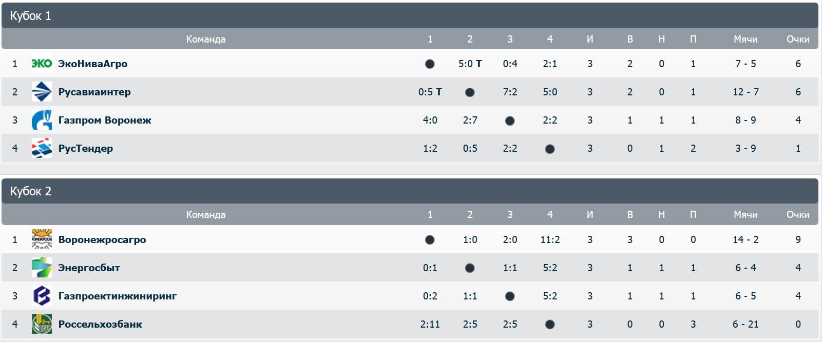 В «Кубке 2» «Воронежросагро» разгромил «Россельхозбанк» со счетом 11:2. Пента-трик записал на свой счет Денис Дубровин. А «Энергосбыт» и «Газпроектинжиниринг» сильнейшего выявить не смогли - 1:1, но такой результат устроил команду «Энергосбыт» - они взяли серебро в своем Кубке. «Газпроектинжиниринг» стали третьими. А золотым кубком удостоилась команда «Воронежросагро».