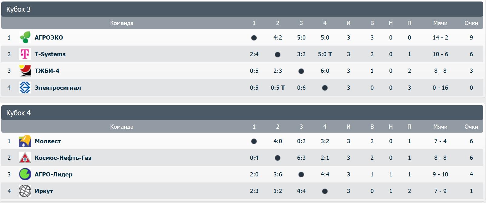 В «Кубке 4» «Молвест» в упорной борьбе переиграл «Иркут» 3:2 и вырвал Кубок чемпионов. А «Космос-Нефть-Газ» показал отличный футбол в матче против «АГРО-Лидера» и заслуженно победил со счетом 6:3. В результате команда «Космос-Нефть-Газ» по личной встрече уступила «Молвесту» и заняла второе место. «АГРО-Лидер» стал бронзовым призером.