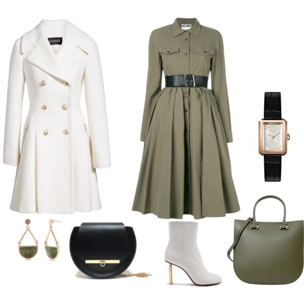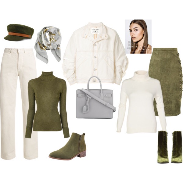 Для зимнего типажа нахождение рядом с лицом цвета хаки – вето, если вы конечно не хотите чтобы вас сравнивали с тоской зеленой или позеленевшей от злости особой. Как исправить ситуацию? Легко! Нижняя часть комплекта – юбка, брюки, обувь. А также аксессуары. Верхняя часть безусловно белого цвета.